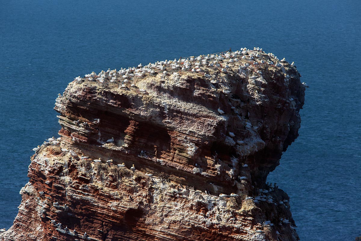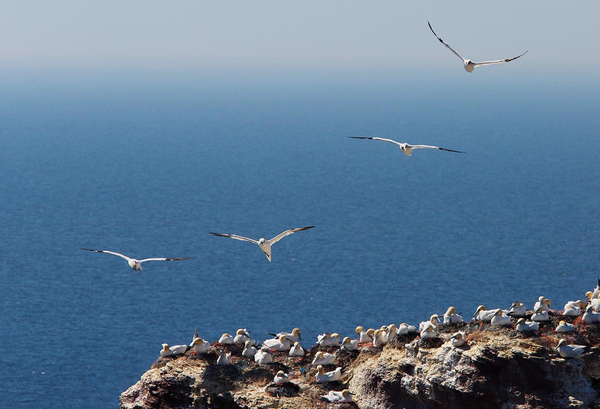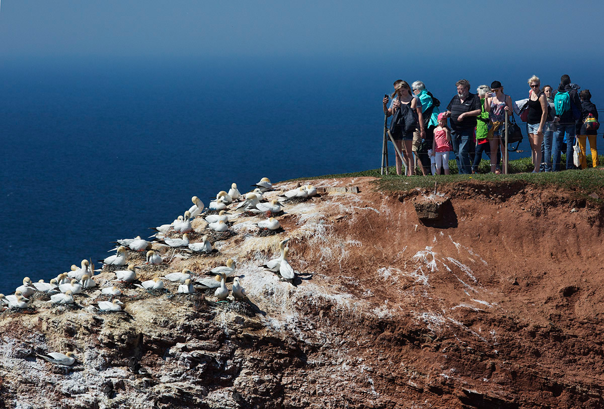 About 70 km from mainland Germany, the cliffs of Helgoland rise 60 meter from the North Sea. The high cliffs are home to the only seabird colonies in Germany, where species like Gannet, Guillemot, Razorbill and Kittiwake breed. These seabirds come to land only to breed and they spend the rest of the year at sea. From the top of the cliffs, the breeding birds can be seen up close. For many migratory birds, Helgoland is an important stopover because of its isolated position in the North Sea. Helgoland is a popular tourist destination, mainly due to the tax-free sales of tobacco, alcohol and perfume.