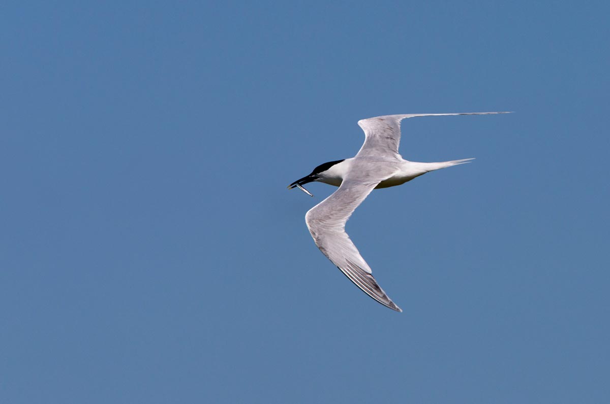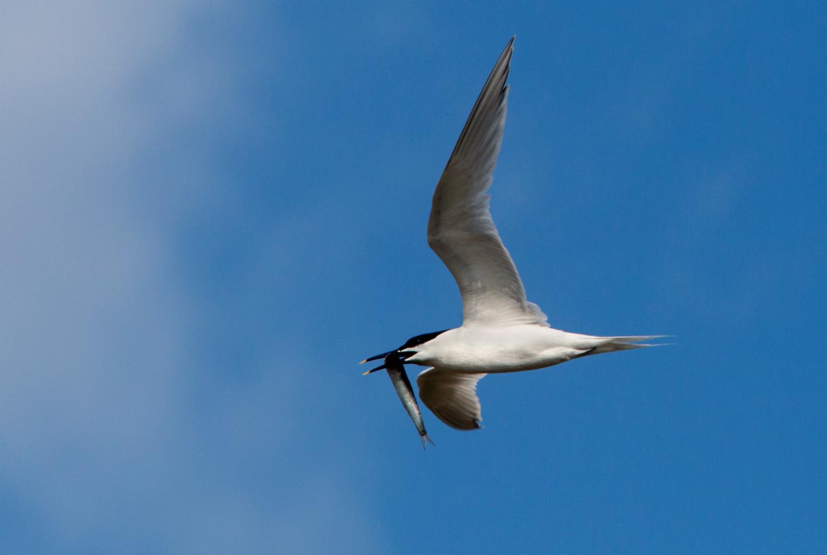With its black cap and yellow-tipped bill, the Sandwich tern is easy to recognize. The Sandwich tern is a resident bird of the North Sea from march to september. They are social birds and breed in coastal colonies. After breeding most of the birds migrate to Western Africa.